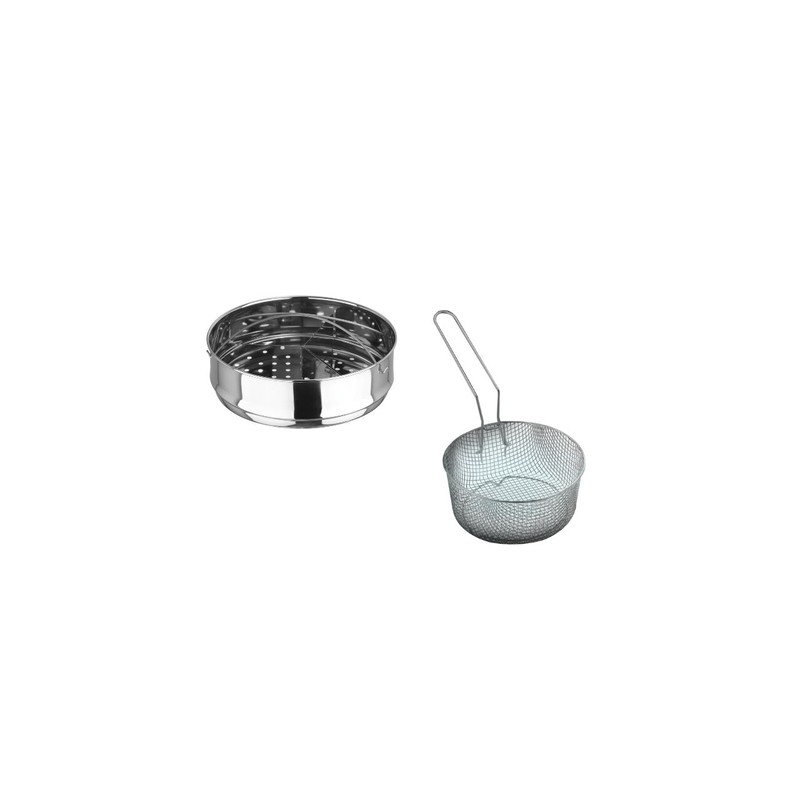 Complétez votre Cocotte Prestige avec ces deux accessoires astucieux : un panier vapeur et un panier à friture avec poignée amovible, conçus pour élargir vos possibilités en cuisine.