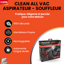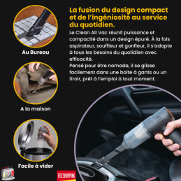 Découvrez le CLEAN ALL VAC, l’aspirateur à main 2 en 1 ultra performant et portable qui aspire et souffle la poussière en un clin d’œil, où que vous soyez !